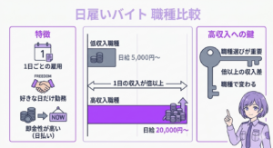 日雇いバイトとは、1日ごとに雇用契約を結んで働く短期雇用の形態であり、長期の勤務義務がなく好きな日だけ働けることが最大の特徴です。月払いのアルバイトと異なり、日払いや週払いに対応しているケースが多く、働いたその日または数日以内に収入を得られる即金性の高さが多くの方に選ばれる理由になっています。高収入を得るためには、どの職種を選ぶかが決定的に重要です。同じ「日雇い」という括りでも、日給5,000円台の職種から20,000円を超える職種まで幅があり、職種選びひとつで1日の収入が倍以上変わることも珍しくありません。