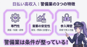 日払いと高収入を同時に満たす職種には、共通した3つの特徴があります。まず「専門性」として、一定の知識や資格・研修が求められるため参入障壁があり、需要に対して供給が追いつきにくい構造になっています。次に「需要の安定性」として、景気や季節に左右されにくい分野であること。最後に「参入障壁」として、誰でも即日入れるわけではなく、一定の準備が必要な点です。警備業はこの3つの特徴をすべて兼ね備えており、日払い高収入バイトとして最も条件が整った職種のひとつです。法定の研修さえ修了すれば未経験でも参加でき、研修のハードルが高すぎないことも警備が選ばれる理由のひとつです。