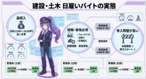 建設・土木系の日雇い案件は日給12,000〜18,000円と高水準ですが、資格保有や実務経験が求められるケースが多く、まったくの未経験者が「今日から入れる」職種ではありません。玉掛け・フォークリフト・足場組立などの資格が必要な案件も多く、資格取得のための初期投資と時間が必要です。建設・土木の日雇いは高収入を得られる反面、未経験者の参入障壁が高く、即日スタートを希望する方には向かない職種です。警備の場合は法定研修(20時間)さえ修了すれば未経験でも即参加できる点で、スタートまでの時間コストに大きな差があります。
