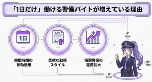「1日だけ」働ける警備バイトへの注目が高まっている背景には、副業ニーズの拡大と即金志向の強まりという2つの大きな流れがあります。本業だけでは生活費や将来への備えが不安という方が増えており、休日の1日を使って手軽に稼げる単発バイトの需要が急増しています。警備の単発バイトは日払い対応の会社が多く、働いたその日または翌営業日には収入が手元に入るため、即金ニーズに応えやすい職種です。フリマアプリや宅配などの副業と比べてもまとまった日給を1日で得られる点が評価されており、「週末だけしっかり稼ぎたい」という方に特に選ばれています。