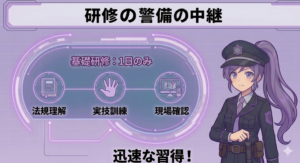 未経験から警備バイトを始める際に多くの方が見落としがちなのが、研修中の給与支給の有無です。警備業法で定められた新任教育(合計20時間)は必須ですが、この研修中に給与が出るかどうかは会社によって異なります。研修中も給与が支給される会社を選ぶことは、未経験者がお金の不安なく学びに集中できる環境を手に入れることを意味します。フェイス警備の研修では、研修内容も実際の現場を想定した実践的な構成で、法律知識から誘導の実技まで体系的に学べます。