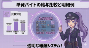 東京で警備の日払いバイトを選ぶ際に大切なのは、日給の高さだけで判断しないことです。公安委員会の認定を受けた正規の会社かどうか、研修中も給与が支給されるか、日払いの具体的な条件はどうか、シフトの自由度は十分かという4点を軸に比較することで、入社後のトラブルを防ぎながら長く働ける職場を見つけられます。「日払いOK・未経験歓迎・シフト自由」の3条件がすべて揃っている会社を選ぶことが、東京で警備日払いバイトを始める際の成功の鍵です。交通誘導・施設・イベント・雑踏・列車見張りとさまざまな種別があるため、自分のライフスタイルや体力・希望収入に合った種別から始めることも大切なポイントです。